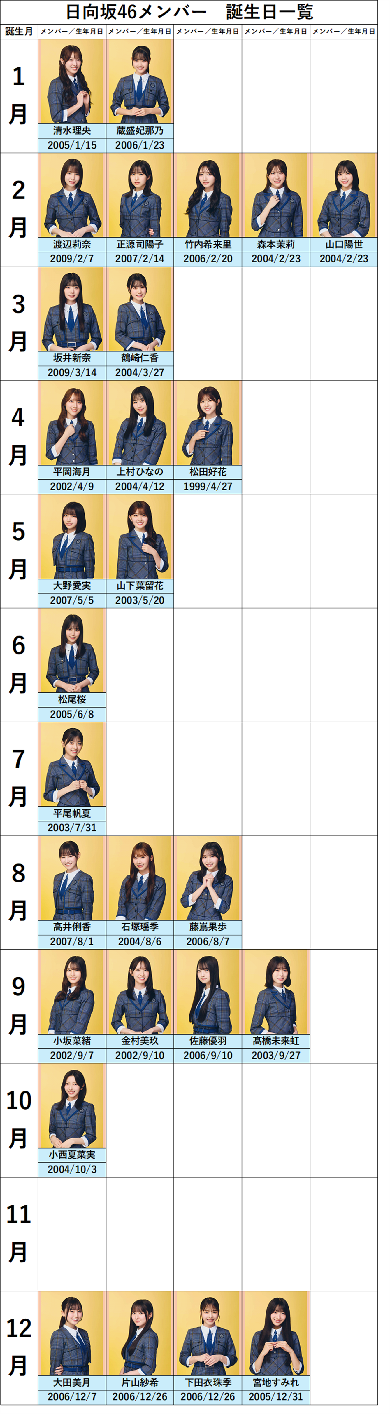 スポンサーリンク 【日向坂46】メンバー誕生日一覧 2025.11.24 日向坂46メンバー29名の誕生日の一覧です。 【乃木坂46】メンバー誕生日一覧はコチラ【櫻坂46】メンバー誕生日一覧はコチラ【坂道グループ】メンバー誕生日一覧はコチラ