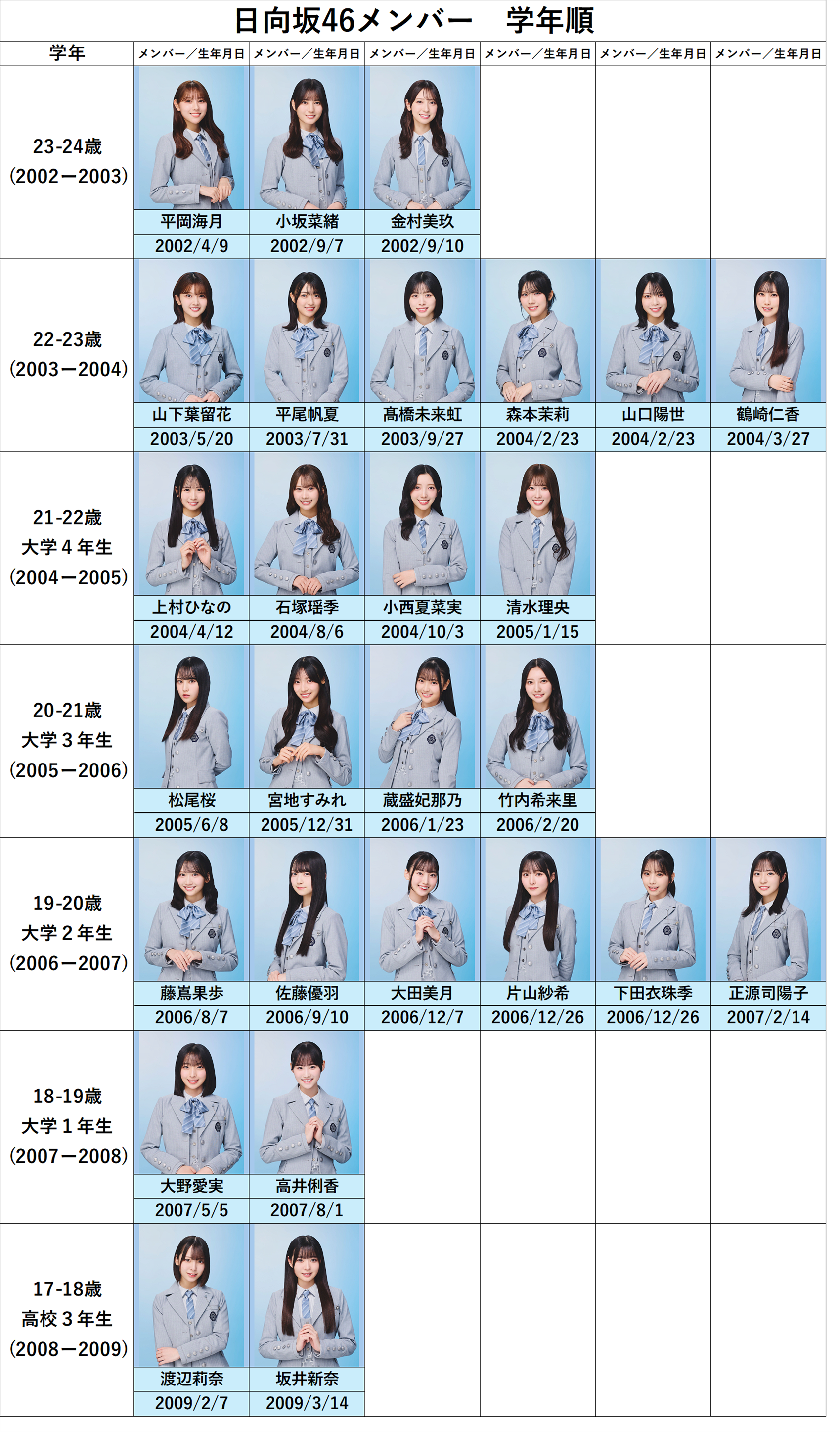 日向坂46メンバーを学年順(年齢順)に並べてみました。