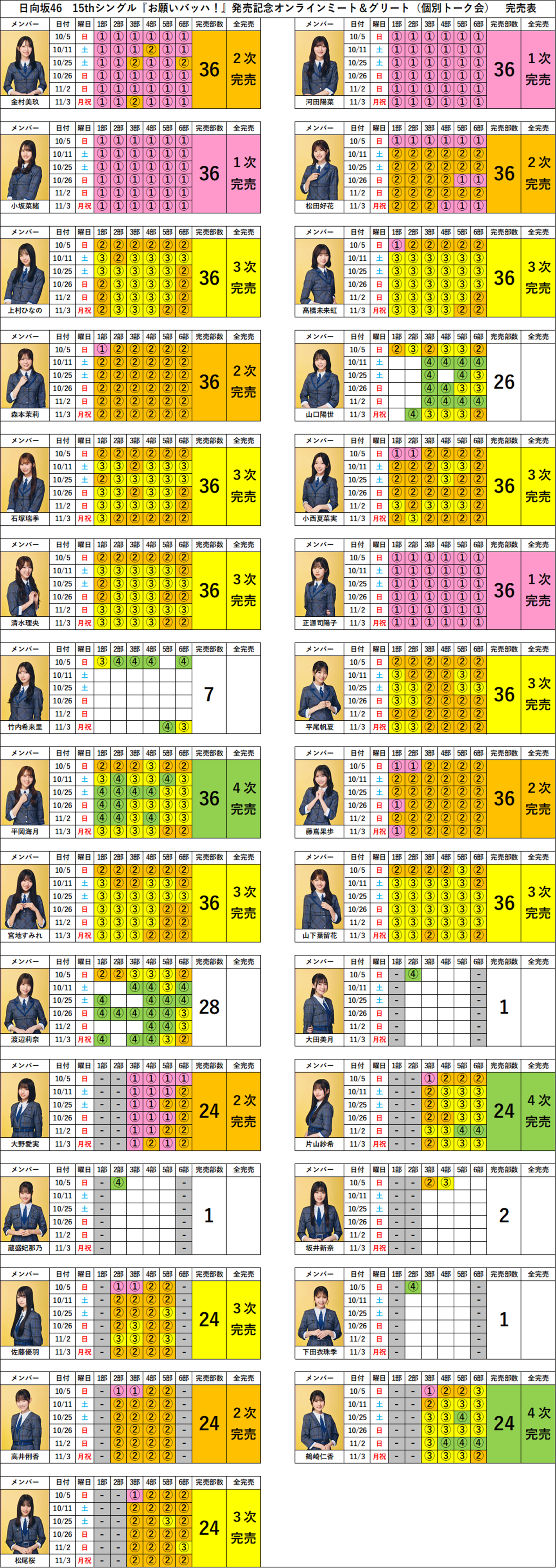 この記事では、日向坂46 15thシングル『お願いバッハ!』発売記念オンラインミート&グリート(個別トーク会)完売表をまとめています。