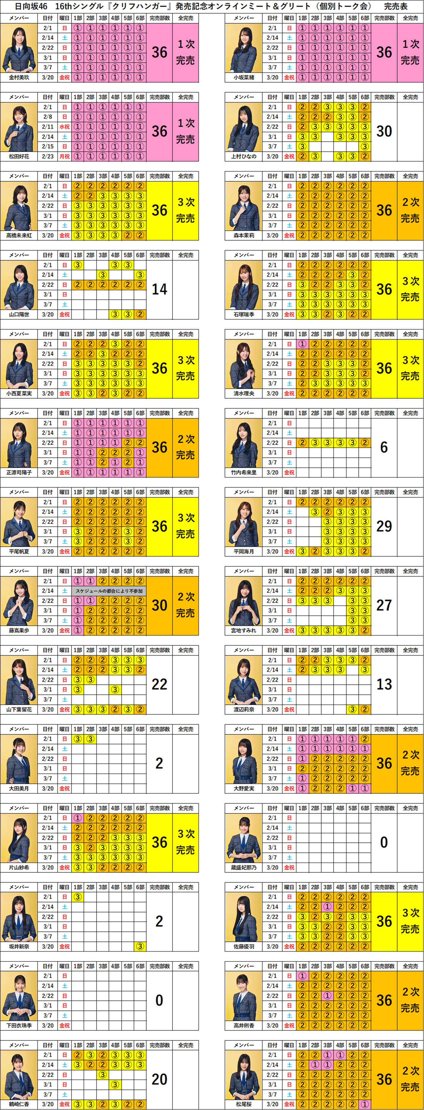 【日向坂46ミーグリ完売表】16th『クリフハンガー』発売記念オンラインミート&グリート完売表(第3次受付)