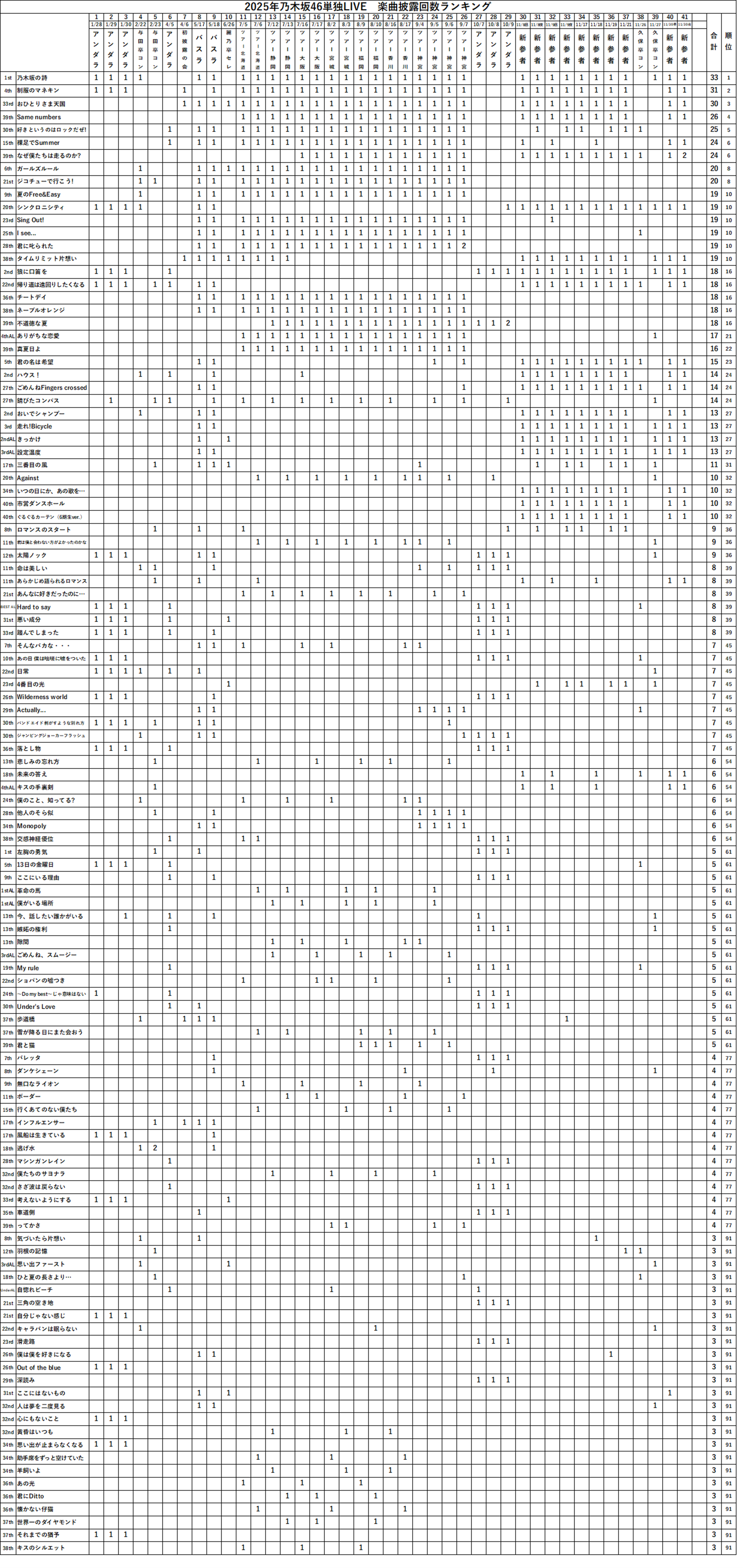 スポンサーリンク 【乃木坂46】2025年単独LIVE 楽曲披露回数ランキング(11/30時点) 2025.11.30 11/30「乃木坂46六期生新参者千秋楽」を終えた時点での「2025年乃木坂46単独LIVE楽曲披露回数ランキング」を更新しました。 今年3回以上披露されたものをランキングに載せています。