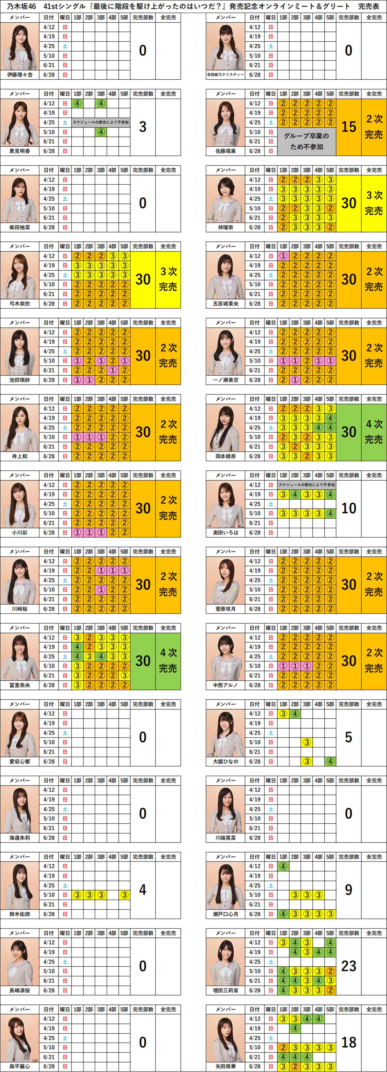 【乃木坂46ミーグリ完売表】41st「最後に階段を駆け上がったのはいつだ?」発売記念オンラインミート&グリート完売表(第4次受付)