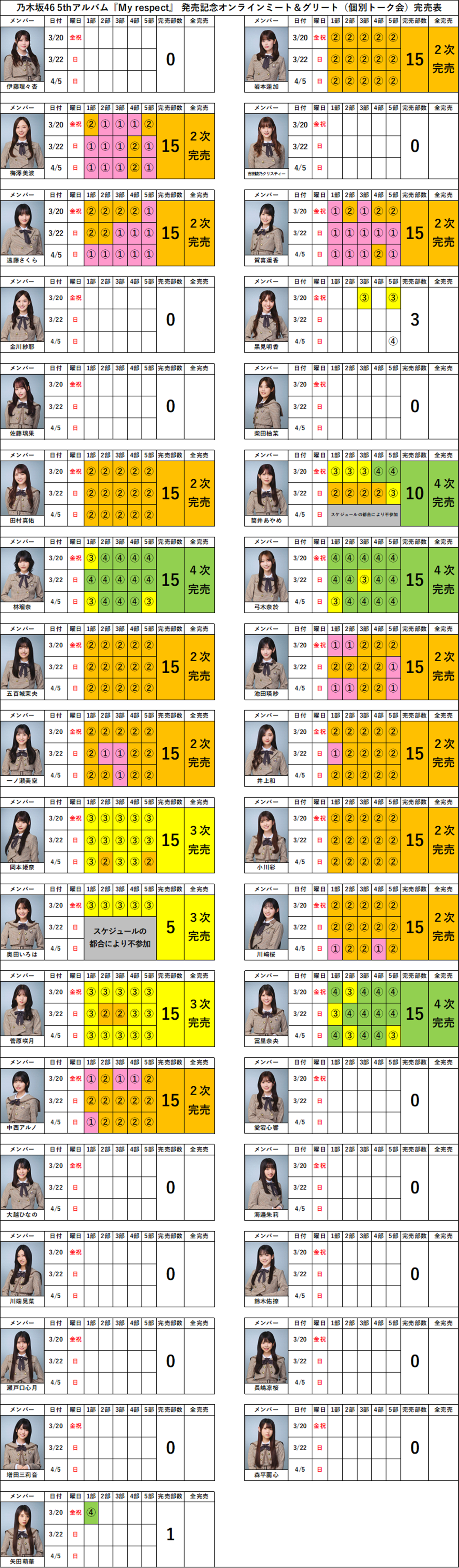 【乃木坂46ミーグリ完売表】5thアルバム「My respect」発売記念オンラインミート&グリート完売表(第4次受付)《1/15更新・最新版》