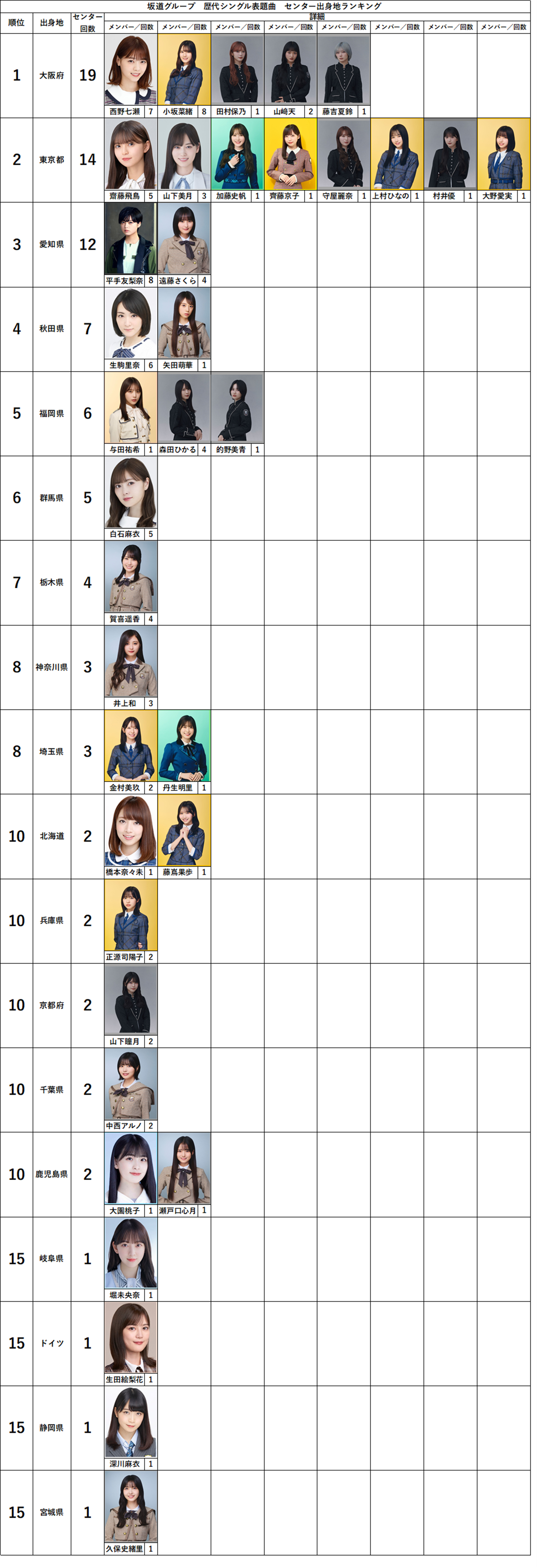 それに伴い、坂道グループの『歴代シングル表題曲センター出身地ランキング』は上記のようになりました。