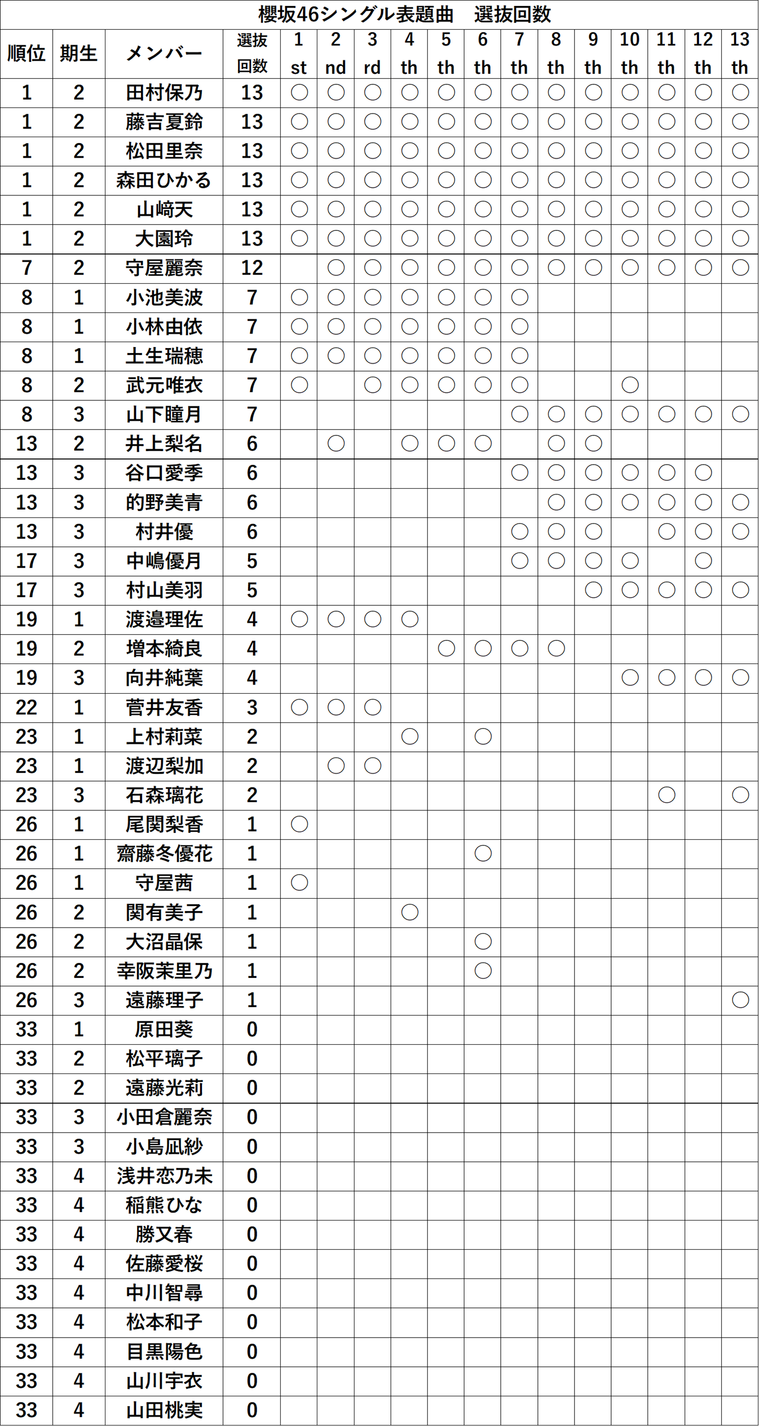 それに伴い、下記のように歴代の『櫻坂46シングル表題曲 選抜回数ランキング』を更新しました。