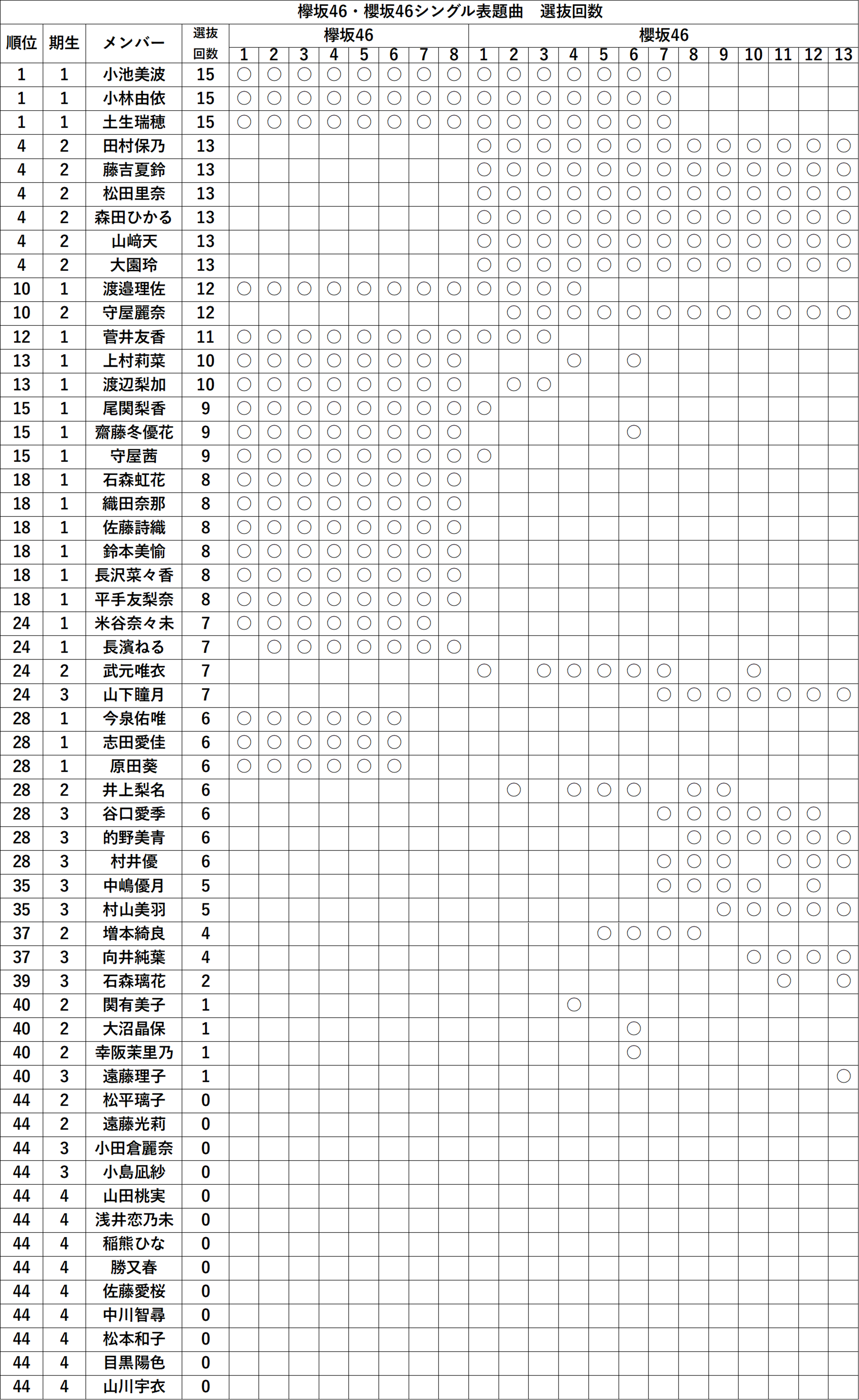 『欅坂46・櫻坂46シングル表題曲 選抜回数ランキング』も更新しました。