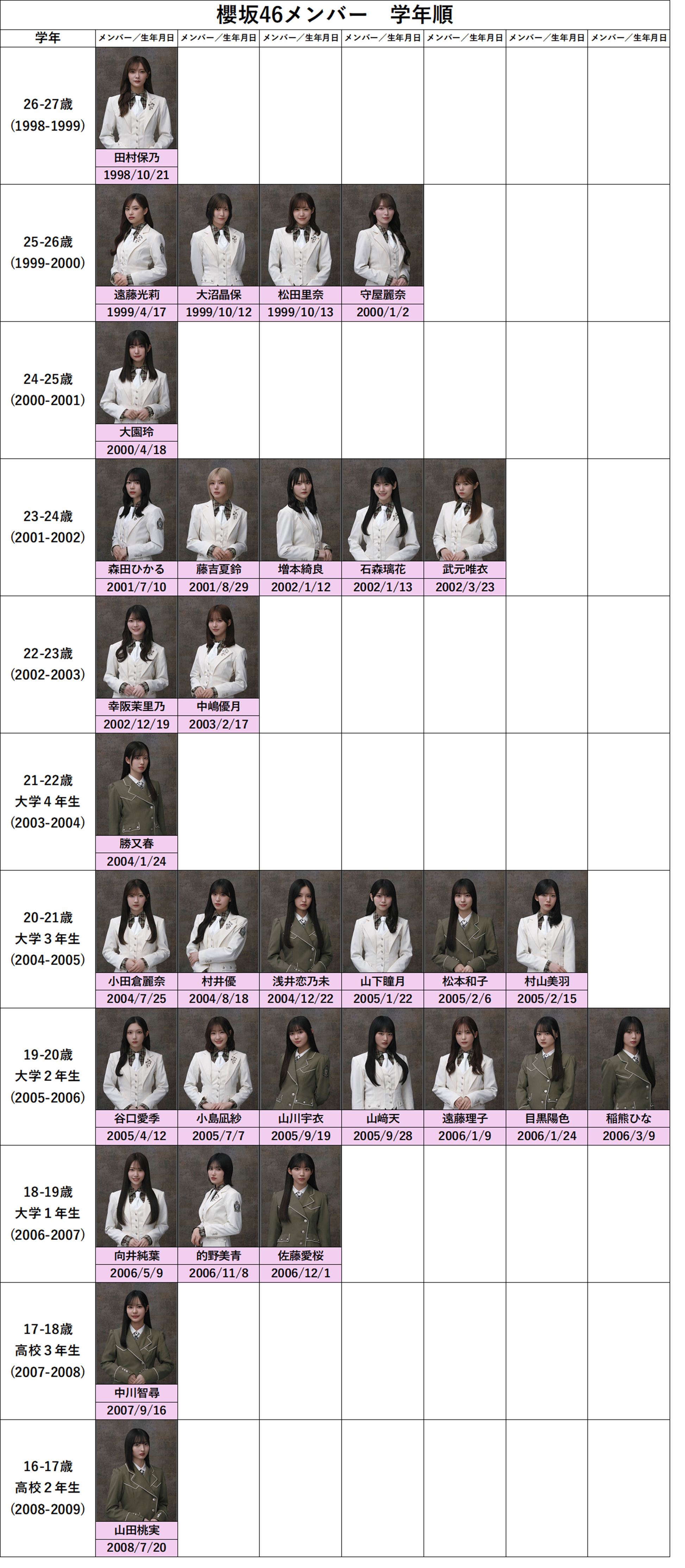 櫻坂46メンバーを学年順(年齢順)に並べてみました。
