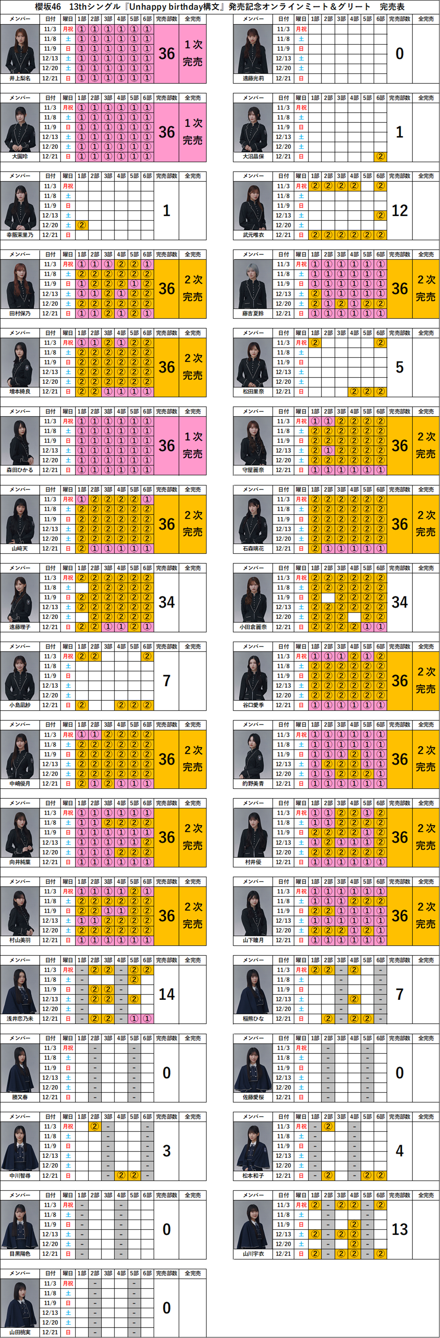 この記事では、櫻坂46 13thシングル『Unhappy birthday構文』オンラインミート&グリート(ミーグリ)完売表をまとめています。