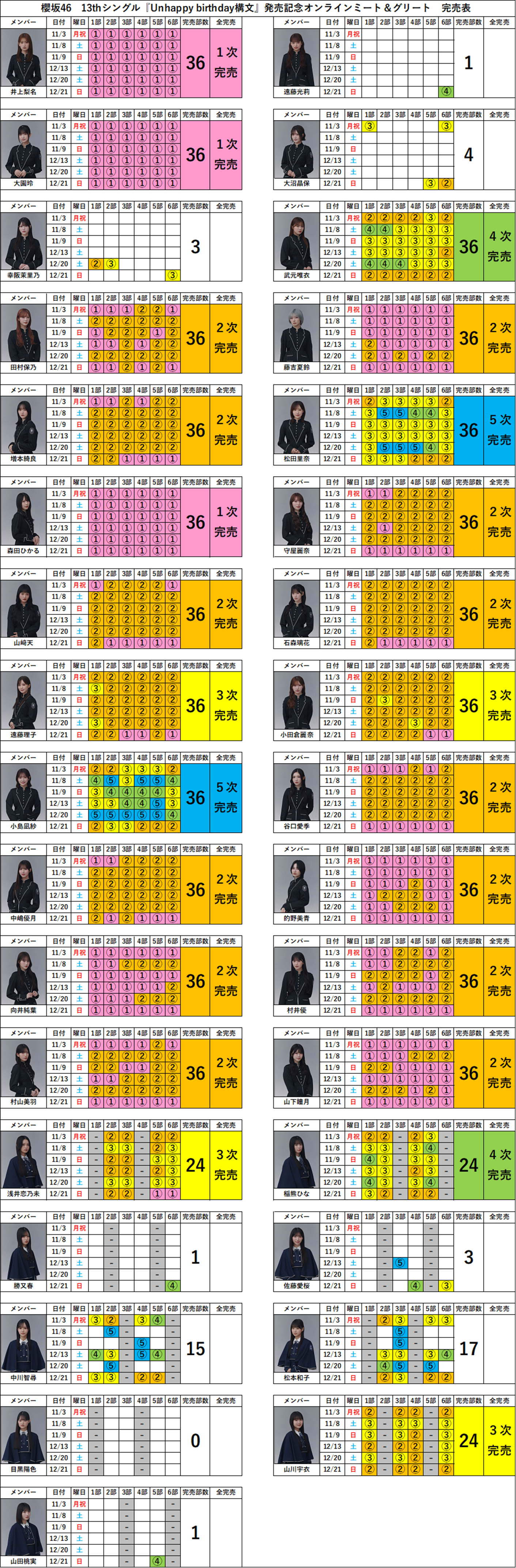 【櫻坂46ミーグリ完売表】13thシングル『Unhappy birthday構文』発売記念オンラインミート&グリート完売表(第5次受付)