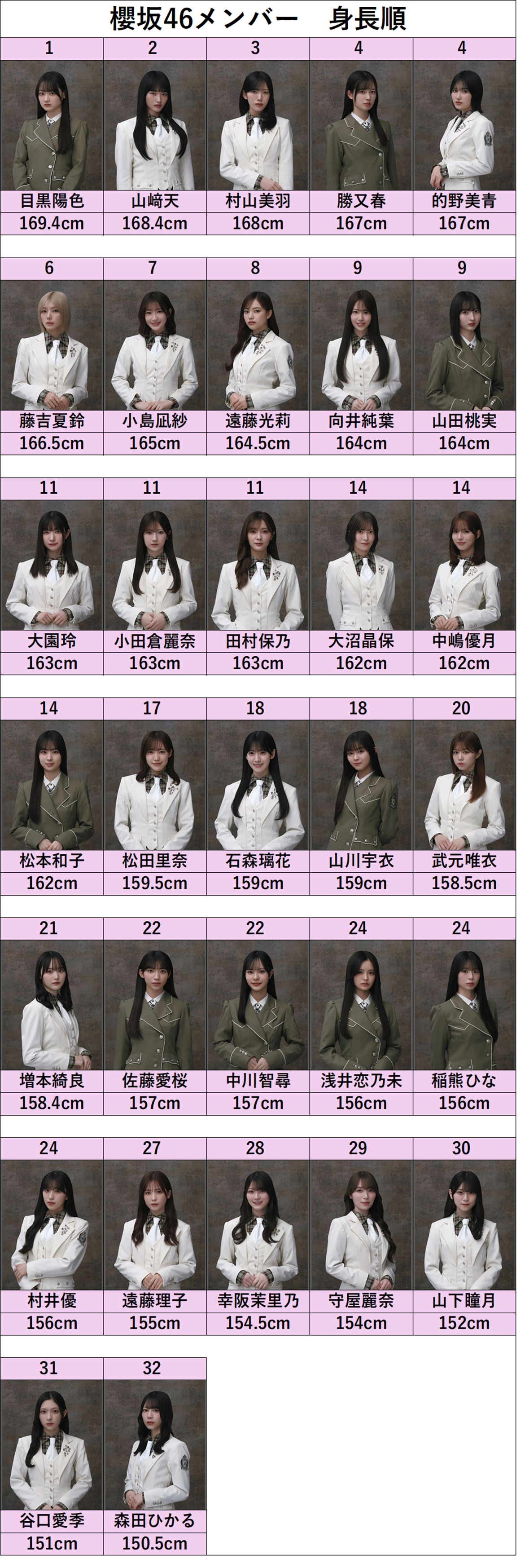 櫻坂46メンバーの平均身長は160.4cm、中央値は160.8cmです。